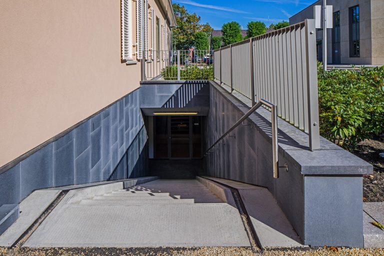 In diesem Projekt hat Holonite mit isolierten Fassadenleisten, Fensterbrüstungen und maßgefertigten Treppenstufen beigetragen. Die isolierten Fassadenleisten verleihen den altrosa Fassaden nicht nur ein stattliches Aussehen, sondern schützen gleichzeitig den empfindlichen Fuß des Gebäudes. Die hellen Fensterbrüstungen harmonieren schön mit den weißen Fensterläden. Schließlich runden die maßgefertigten Treppenstufen das Ganze ab und sorgen für eine gute Verbindung zum darunterliegenden Parkhaus. Holonite hat die Treppenstufen mit integrierten Antirutschprofilen versehen.