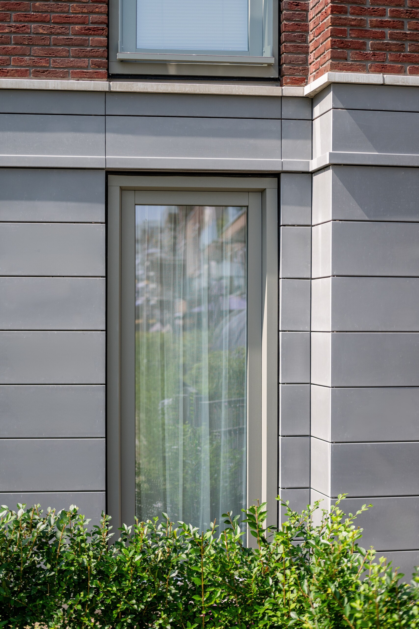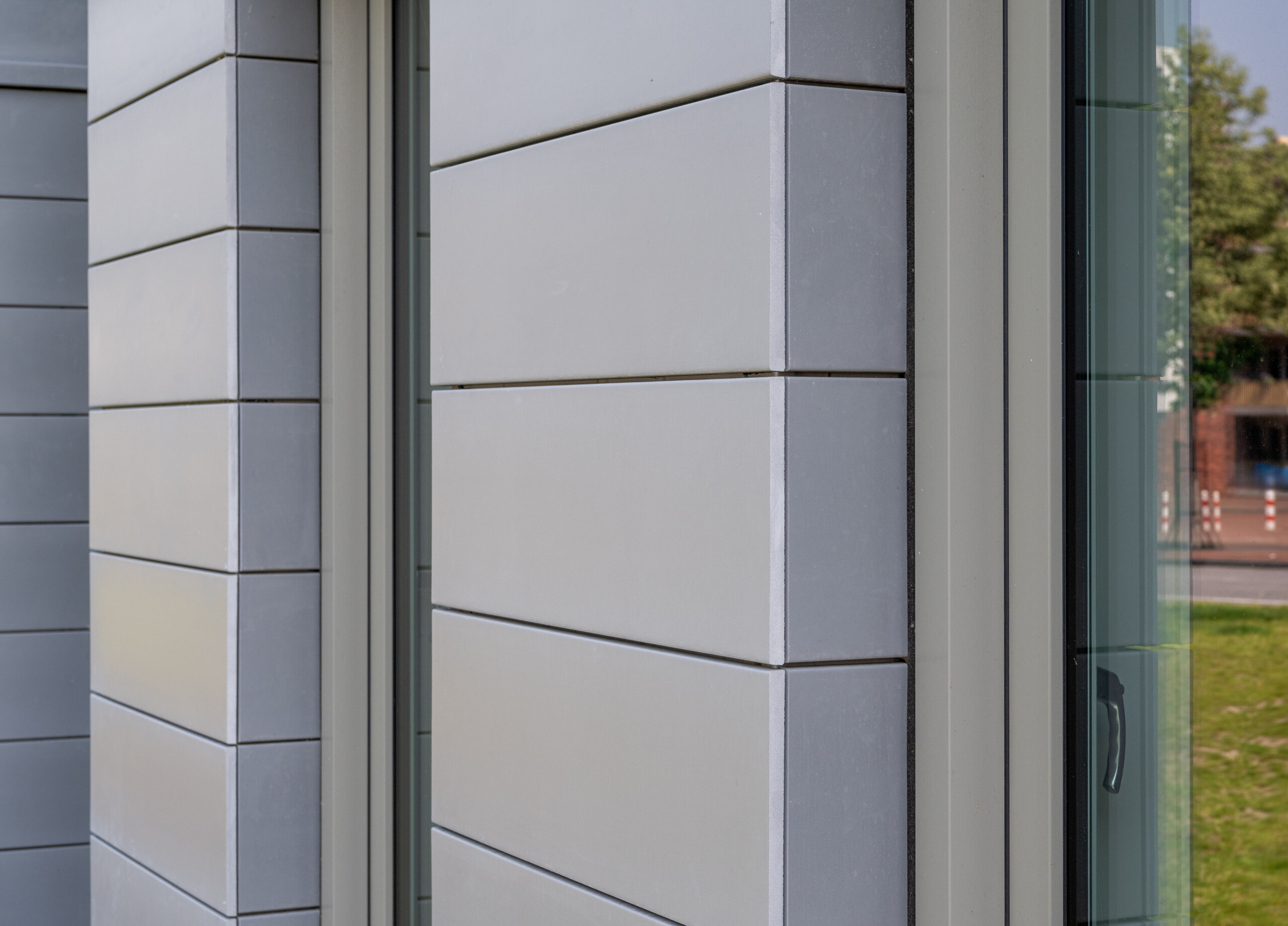 Ein wichtiges Element in der Fassadenarchitektur sind die Holonite-Fassadenplatten in einem dunkelgrauen Farbton. Diese Platten betonen die horizontalen und vertikalen Linien des Gebäudes und verleihen ihm ein modernes und robustes Aussehen. Holonite leistet damit einen wesentlichen Beitrag zum Erscheinungsbild des Projekts. Die dunklen Paneele bilden einen schönen Kontrast zum Mauerwerk und sorgen für eine Tiefe und ein Detail, das die Fassade zusätzlich belebt.