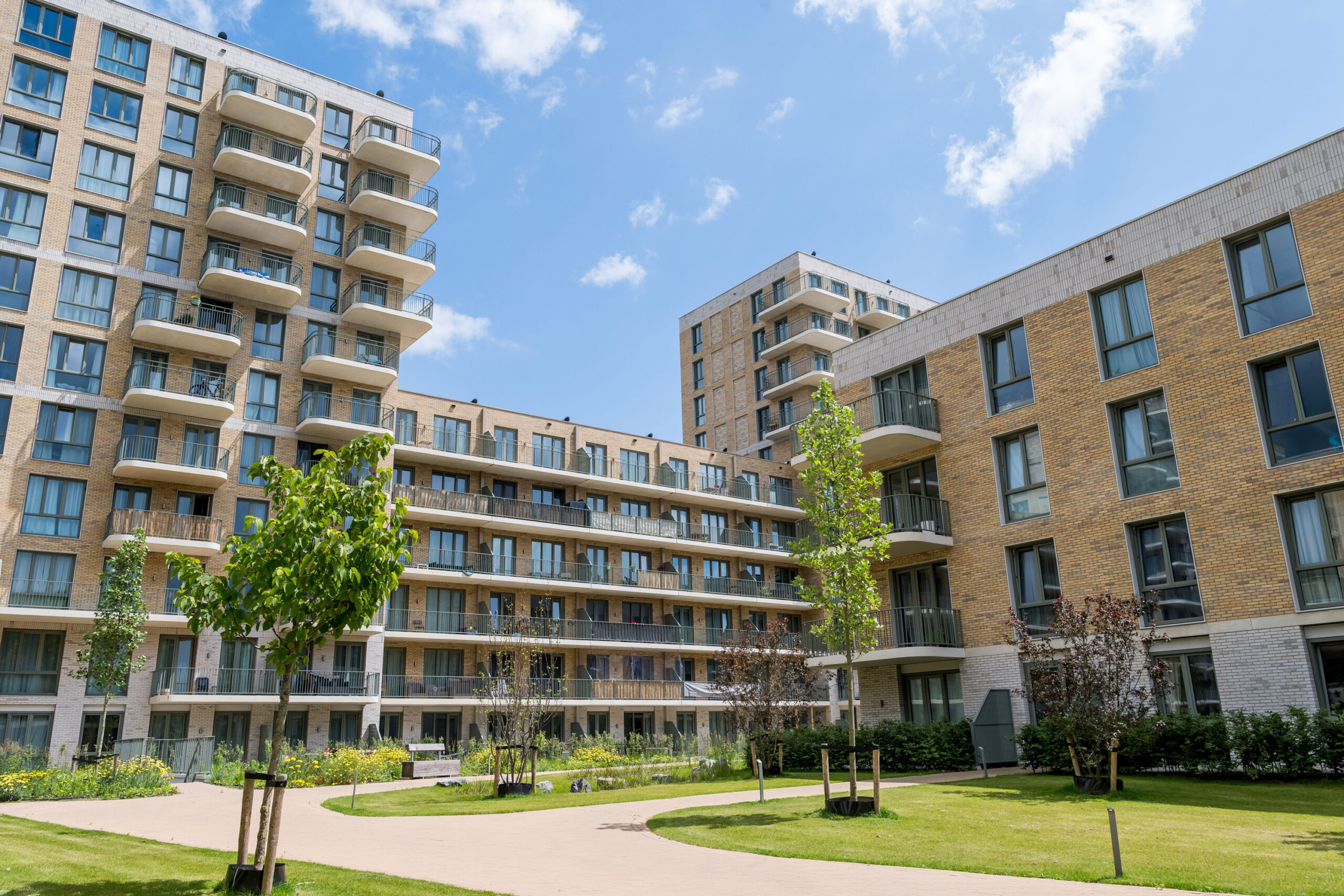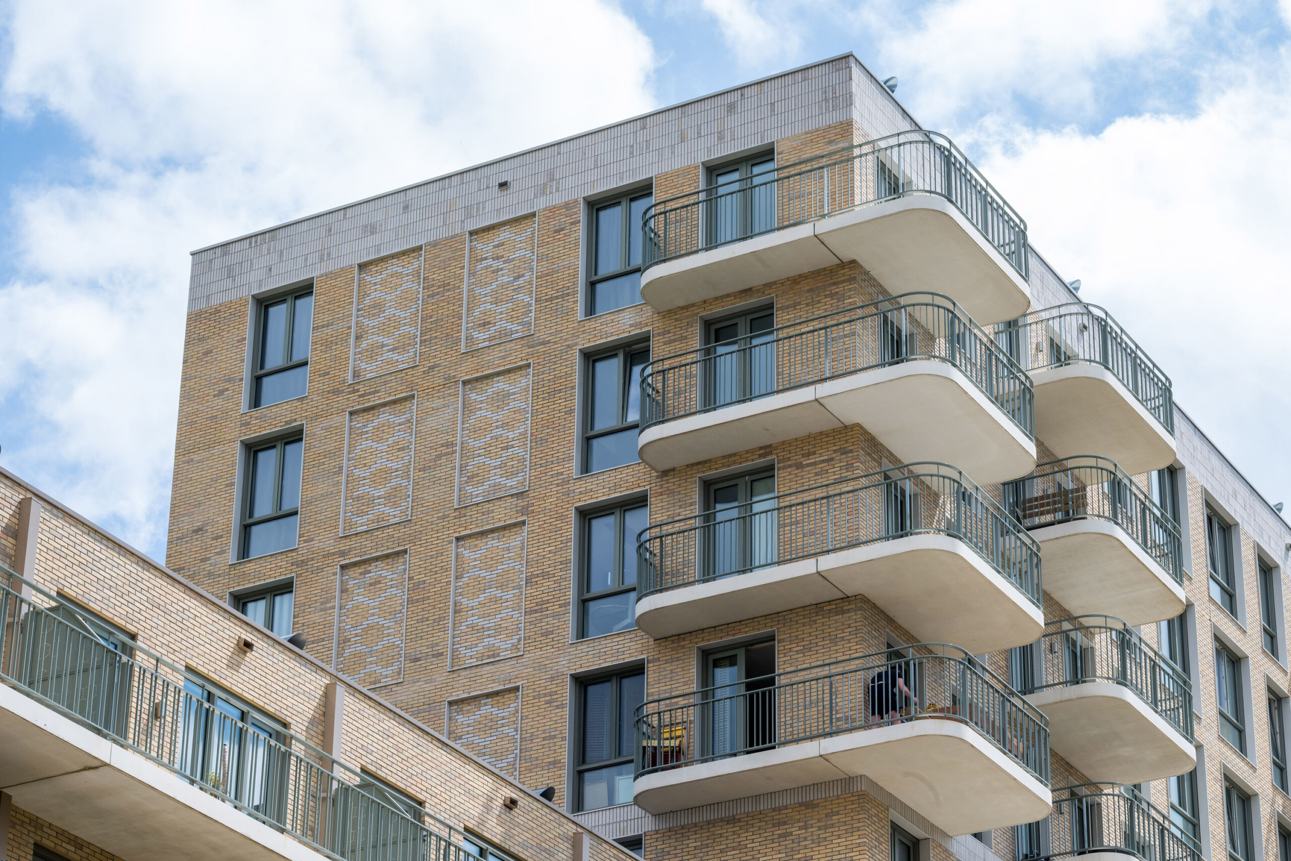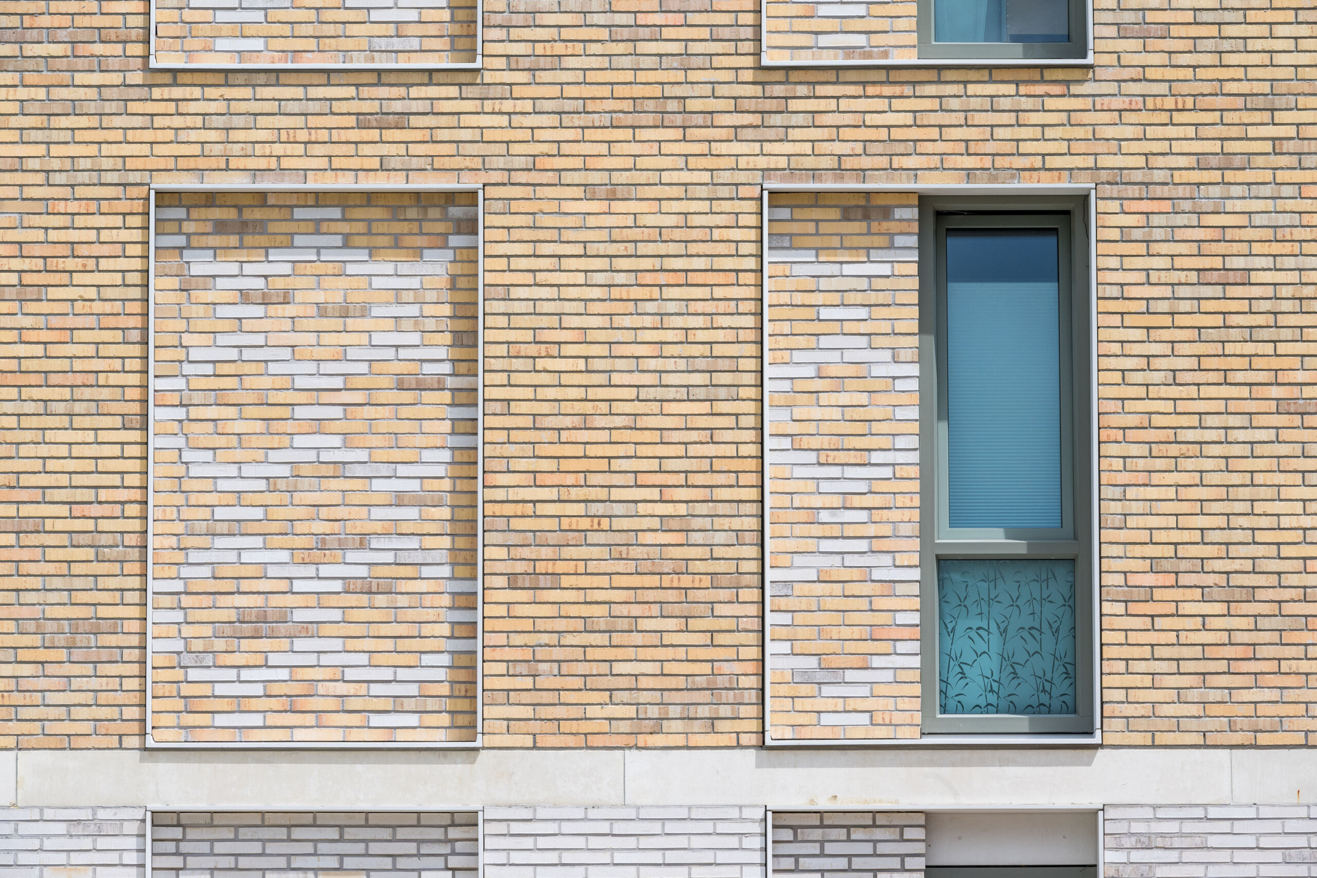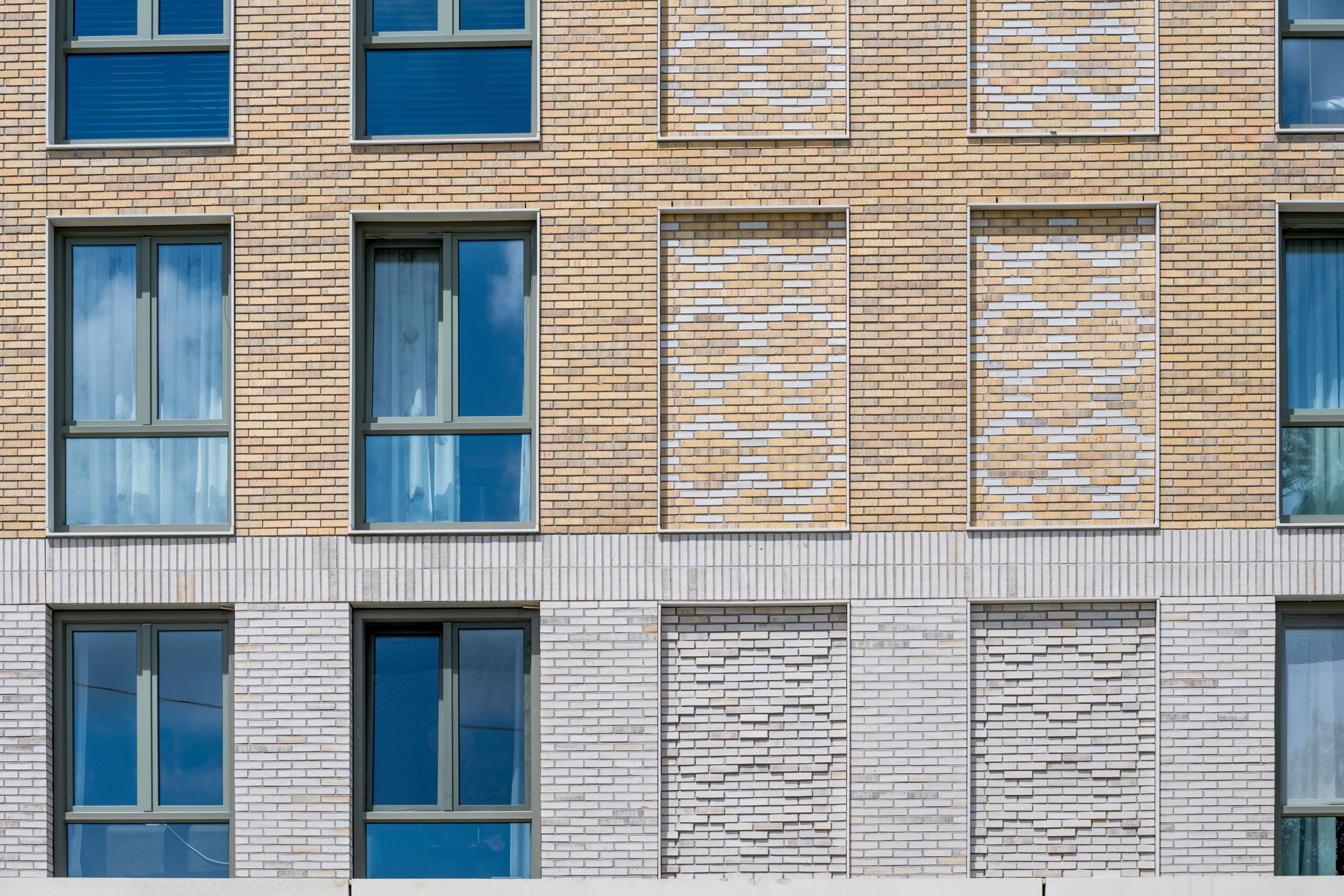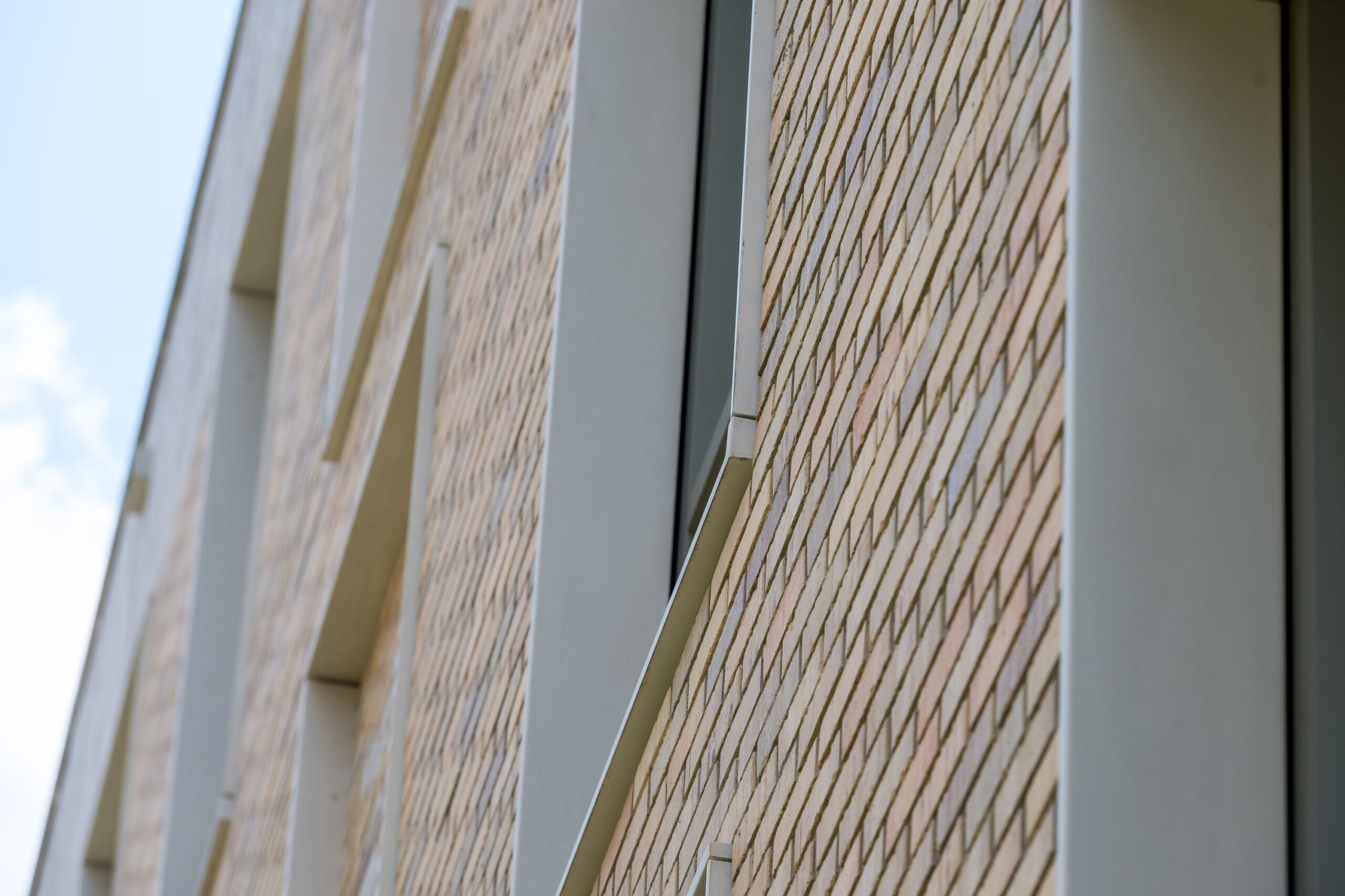 Eine dieser intelligenten Entscheidungen ist die Verwendung von weißem Verbundstein als Umrahmung der Fensterpartien in den oberen Stockwerken. Die verschiedenen Wohnblöcke haben eine robuste Ausstrahlung mit viel Backstein und Beton. Die weißen Rahmen verleihen den Fassaden einen spielerischen Charakter. Dies wird dadurch akzentuiert, dass die Verbundstein-Umrahmung etwas hervorsteht und aus allen Blickwinkeln schön frisch weiß ist. Zudem ist es ein sehr nachhaltiges Material. Verbundstein hält enorm lange und ist nach dem Recycling vollständig wiederverwertbar. Auch das ist im Rahmen der aktuellen Gesetzgebung und dem ausdrücklichen Wunsch der Auftraggeber von wesentlicher Bedeutung. Verbundstein ist pflegeleicht, verschleißfest und lässt sich einfach von beispielsweise Graffiti befreien.