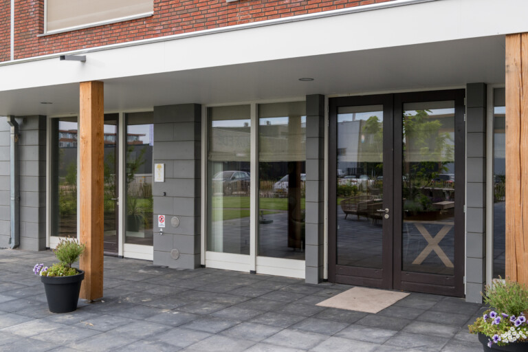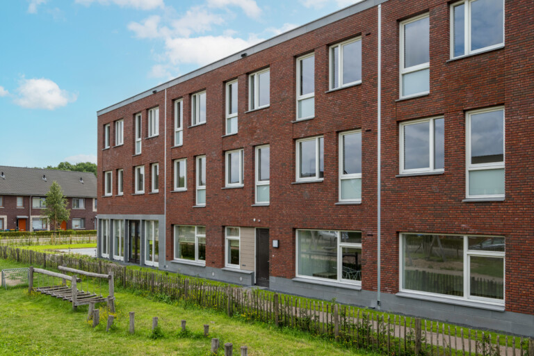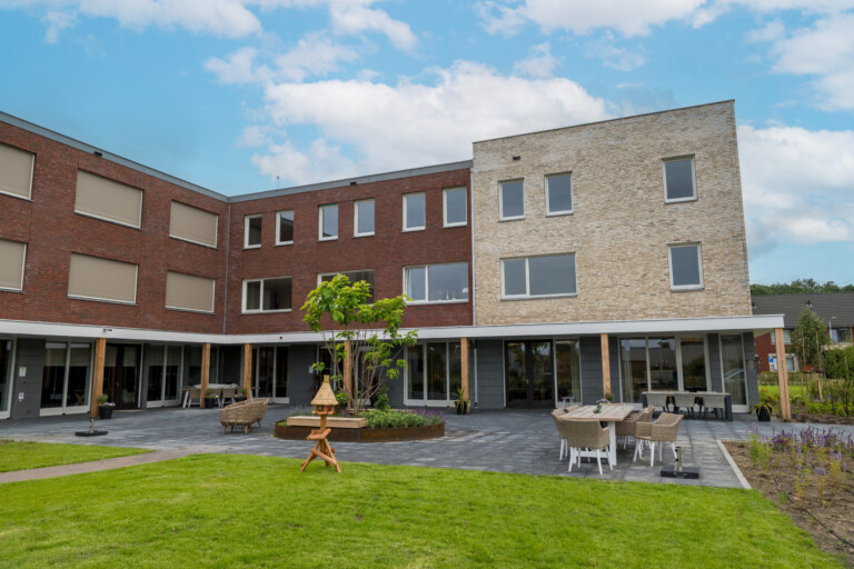 Auch in Bezug auf die Architektur wurde die Verbindung zum Viertel gesucht. Nicht so sehr in der Formensprache, sondern vielmehr in der Ausstrahlung, betont Groenendijk. „Um die verfügbaren Quadratmeter optimal zu nutzen, haben wir einen dreistöckigen Neubau mit Flachdach entworfen. Beide verbundenen Wohngebäude bieten Platz für 24 Bewohner. Das gemeinschaftliche Wohnen ist ‚wie zu Hause‘ im Erdgeschoss eingerichtet, während sich die Schlafzimmer in den oberen Etagen befinden. Die Bewohner leben also mit den Füßen auf dem Boden und mit Blick auf den Garten, den sie frei betreten können. Der Garten sorgt dabei für eine natürliche und sichere Abgrenzung zwischen Innen- und Außenwelt.„