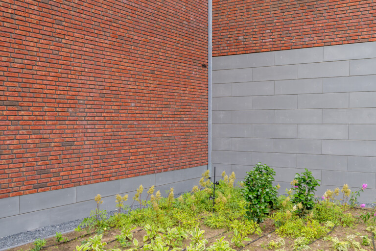 Die Fassaden sind wie die benachbarten Häuser in braunrotem Mauerwerk ausgeführt, kombiniert mit einem Akzentblock in Hellbeige. „Um auch den Sockel hervorzuheben, suchten wir nach einem passenden Plattenmaterial, das wir in den Fassadensockeln von Holonite fanden.„
