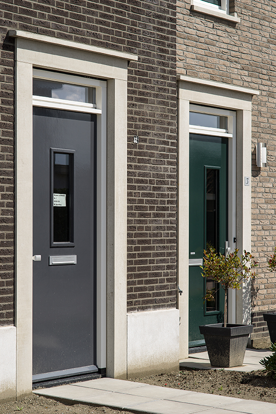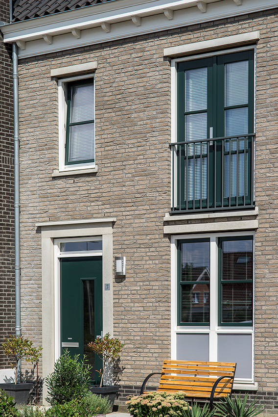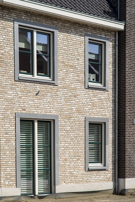Holonite hat zu diesem Projekt mit Fensterbänken in Kombination mit Sockeln, Laibungen und Mauerabdeckungen beigetragen. Die dunkelgrauen Rahmen um die Fenster und Haustüren in den spielerisch versetzten Fassaden bilden ein besonderes und warmes Straßenbild. Auch strahlt das gesamte Viertel aus, dass mit Hingabe daran gearbeitet wurde und bietet eine ausgezeichnete Wohnqualität.