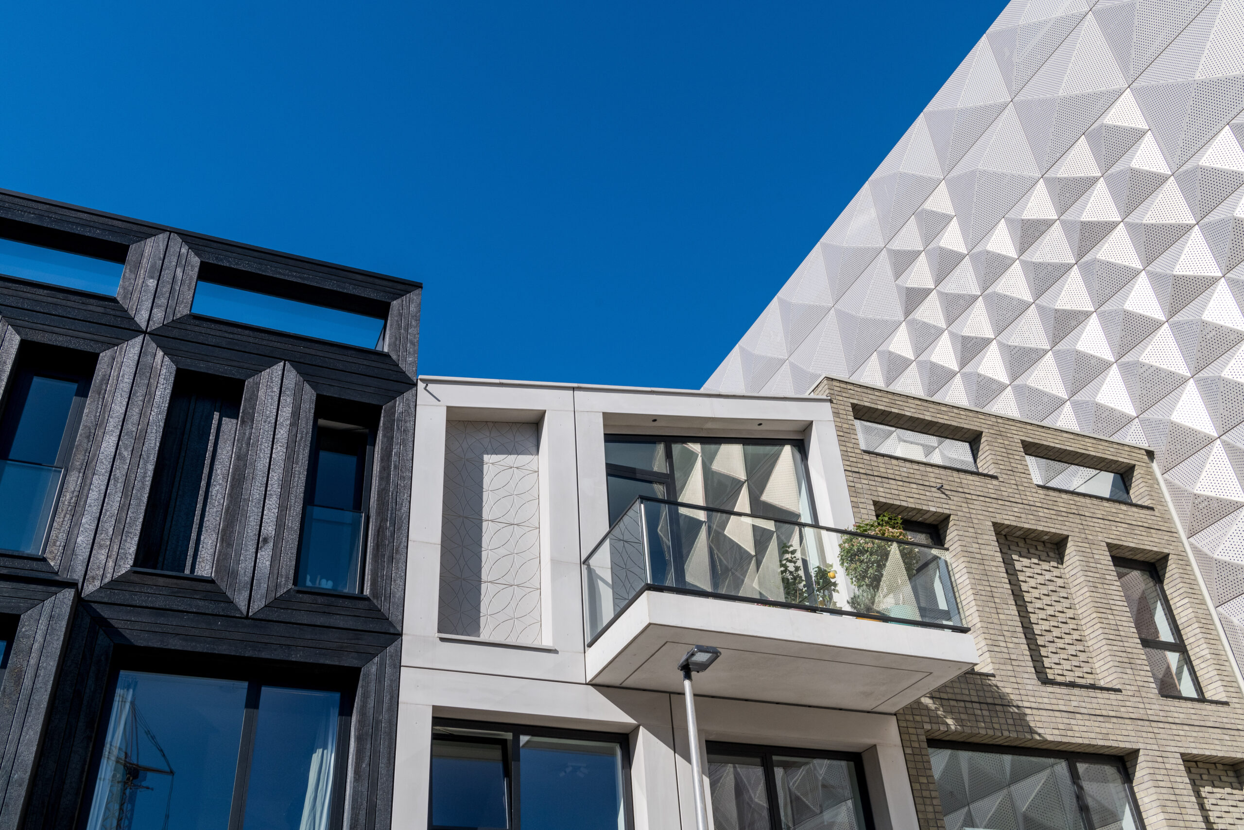 ‚Zunächst hatten wir aufgrund des gewünschten massiven Charakters die Idee, die Fassade eines der Häuser aus Beton zu gestalten. Da diese Option aus Nachhaltigkeitsgründen weniger naheliegend war, beschlossen wir, nach einer Alternative zu suchen. Diese fanden wir in Holonite.‘ Holonite besteht aus einer hochwertigen Kompositmischung, in der verschiedene steinbezogene Füllstoffe mit einem Bindemittel vermischt sind. Die glatte und wasserdichte Oberflächenveredelung garantiert eine natürliche und elegante Ausstrahlung des Produkts. ‚Dieses Produkt ist nachhaltiger, lässt sich leichter entwerfen und ist hinsichtlich der Lebensdauer, unter anderem aufgrund des niederländischen Klimas, eine bessere Option als Betonfassaden. Wir haben uns daher bewusst für Holonite entschieden. Das glatte Material bietet Schmutz und Bewuchs kaum Möglichkeit zur Anhaftung und ist leicht zu reinigen. Wir haben zwar kurz wegen der Fugen gezögert, die die Verwendung von Holonite mit sich bringt, aber dank der Bemusterung, des intensiven Kontakts mit Bas van Vliet und der Beweislast in Referenzen waren wir schnell von dieser Anwendung überzeugt.‘