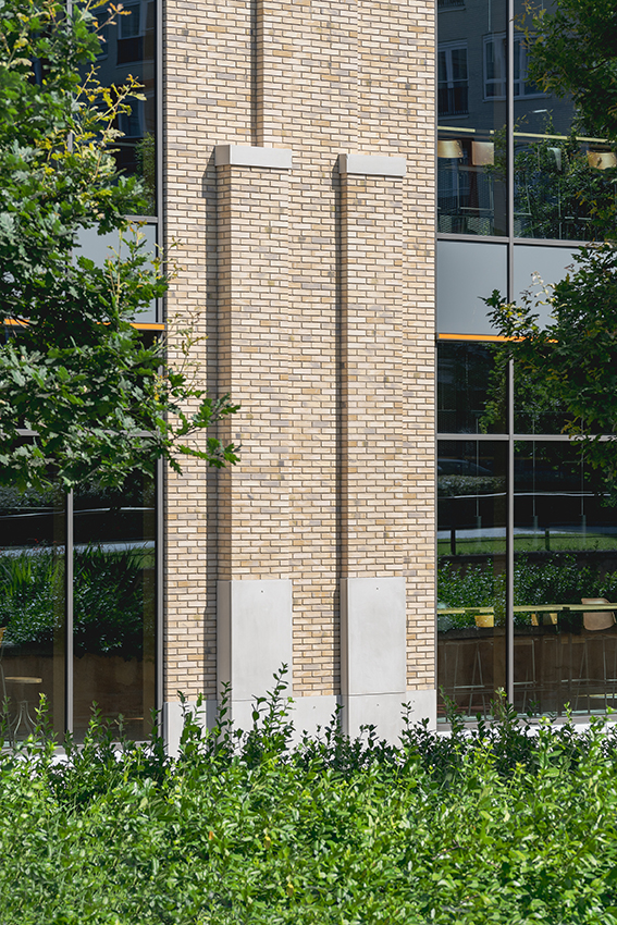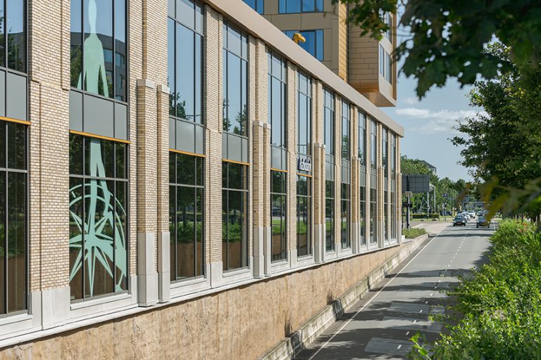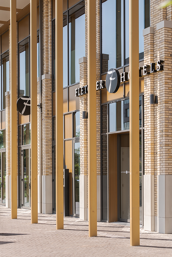 Das Gebäude wirkt imposant. In diesem ‚Look and Feel‘ spielen die Säulen in der Fassade eine wichtige Rolle. Diese Ziegelpfeiler zwischen großen Glasflächen wiederholen sich und sind charakteristisch für die Architektur des Gebäudes. An der Unterseite sind diese Pfeiler mit Fassadensockeln von Holonite verkleidet. An der Oberseite der aus der Fassadenebene hervorspringenden Säulen findet man eine maßgefertigte Holonite-Pfeilerabdeckung. Besonders bemerkenswert ist, dass die Pfeilerabdeckungen innen hohl sind. Dadurch sind es unter anderem leichtgewichtige Elemente mit einem massiven Erscheinungsbild.