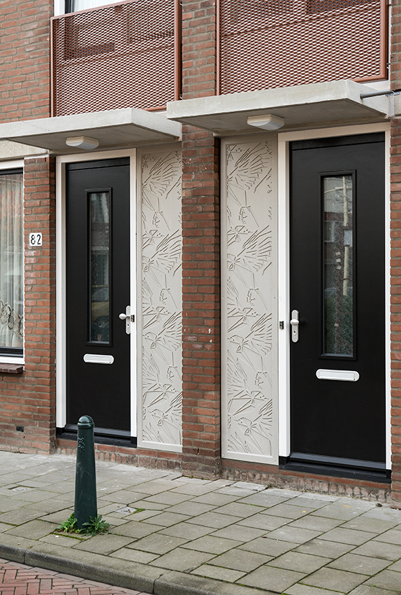 Im Auftrag der Wohnungsbaugesellschaft Staedion wurde kürzlich die Naaldwijksestraat in Den Haag renoviert. Der Grund für die Renovierung war der schlechte Zustand der Fassade und die Zugluft um die Fensterrahmen. Die Fassaden waren aus architektonischer Sicht zunächst nicht hochwertig und sehr veraltet. In Zusammenarbeit mit dem Architekturbüro Vanschagen Architecten und dem Bau- und Bauunternehmen Van Omme & De Groot B.V. wurden daher einige Korrekturen in der Fassadengliederung vorgenommen. Bevor diese Pläne realisiert werden konnten, standen die kooperierenden Parteien vor der Herausforderung, für die bestehenden geschlossenen Fassadenflächen eine Lösung zu finden, die nicht massiv und robust wirkt. Auf der Suche nach dünnen, soliden Paneelen mit einer Struktur, mit dem Hintergedanken eines neuen Impulses für das Viertel und gleichzeitig eines verbindenden Faktors zwischen Bewohner und Nachbarschaft, wurde Holonite kontaktiert. Holonite hat für diese Renovierung einzigartige maßgefertigte Elemente produziert, auf denen auf abstrakte Weise fliegende Sperlinge abgebildet sind. Mit diesem Entwurf hat der Architekt eine Anspielung auf das wichtigste verbindende Element im Schilderswijk der letzten 60 Jahre gemacht: das Nachbarschaftshaus „de Mussen„. Diese besondere Renovierung in Den Haag bildet nun den verbindenden Faktor zwischen Bewohner und Nachbarschaft.