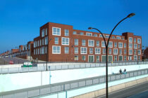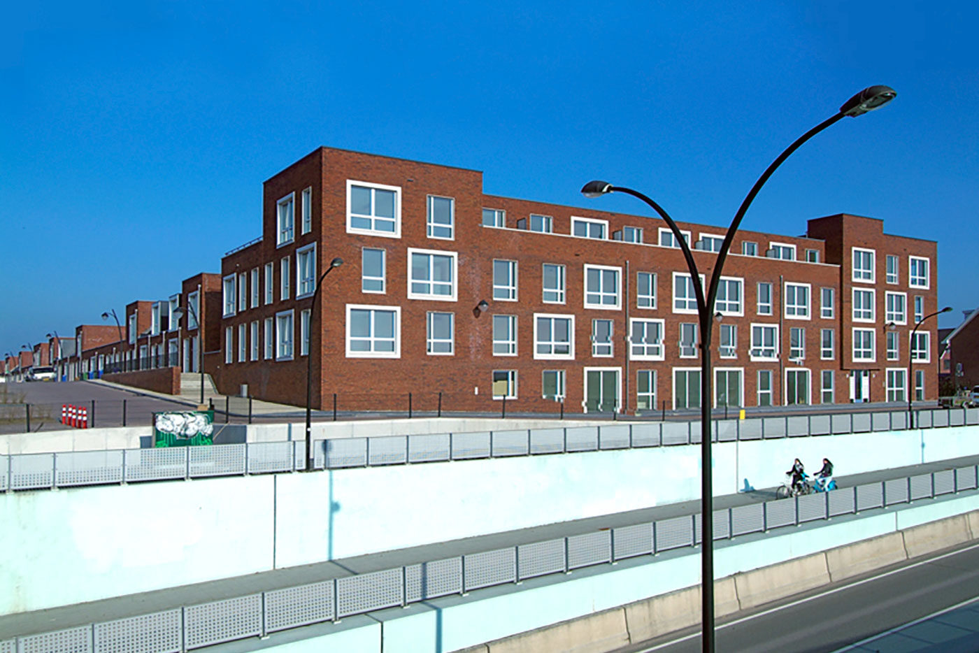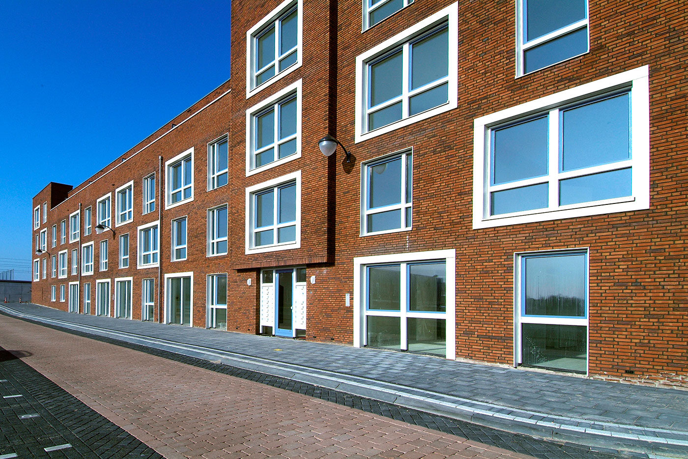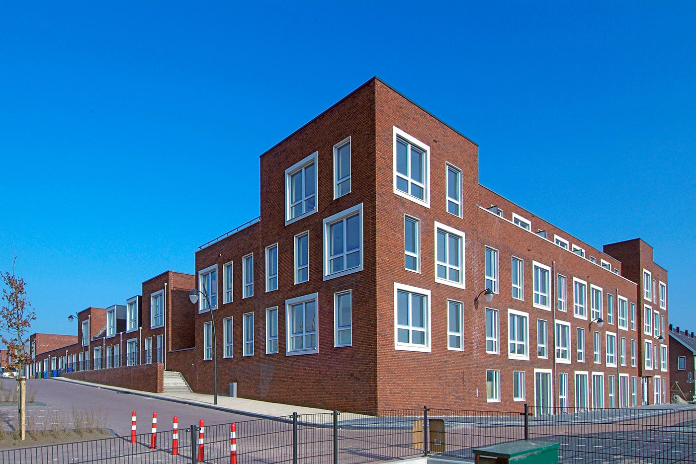 Vathorst, der große Vorort von Amersfoort, erhielt kürzlich einen guten Teilplan hinzu: il Promenade. Die Apartments und die zurückgesetzten Einfamilienhäuser verfügen über Fassaden, die man selten sieht. Hübsches oranges Mauerwerk mit einer dunklen Fuge in Kombination mit kontrastreichen Fensterpartien aus Holonite weiß.
